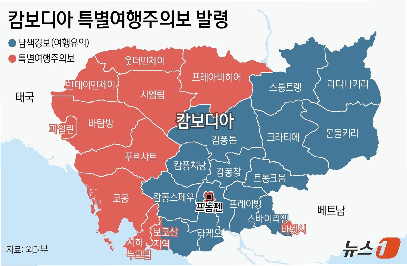 캄보디아 캄폿주 보코산 지역, 바벳시, 포이펫시가 '여행금지' 구역으로 지정되면서 현지 상황에 대한 불안감이 더욱 커지고 있습니다. 시하누크빌주는 '출국권고'로, 캄보디아 전역은 '여행자제'로 여행 경보가 상향되었습니다. 이러한 조치는 캄보디아를 방문하려는 여행객들에게 심각한 경고를 보내는 신호입니다. 뉴스에서는 캄보디아 인근 베트남 국경에서 한국인 여성의 사망 소식이 전해지면서 불안감을 더욱 증폭시키고 있습니다.