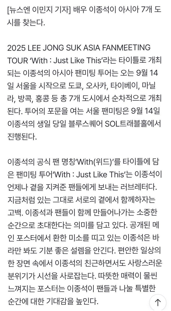 배우 이종석이 아시아 팬들과의 잊지 못할 만남을 예고하며 팬들의 마음을 설레게 하고 있습니다. 소속사 에이스팩토리는 이종석이 아시아 팬들과 '서로의 진심에 더 가까이 다가가는 소중한 시간'을 가질 것이라고 발표했습니다. 2025 LEE JONG SUK ASIA FANMEETING TOUR 'With : Just Like This'라는 이름으로 진행되는 이번 투어는 서울을 시작으로 도쿄, 오사카, 타이베이, 마닐라, 방콕, 홍콩 등 아시아 주요 7개 도시에서 순차적으로 개최될 예정입니다. 팬들을 향한 이종석의 뜨거운 사랑과 진심이 느껴지는 소식에 많은 팬들이 벌써부터 기대감을 감추지 못하고 있습니다.
