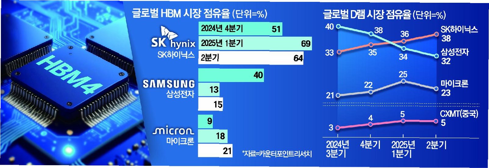 삼성전자는 3분기 전 세계 메모리 시장 1위를 탈환하며, 194억 달러의 매출을 기록했습니다. SK하이닉스는 D램 시장에서 매출액 기준 점유율 35%로 1위를 굳건히 지키고 있습니다. HBM 시장에서도 SK하이닉스는 독보적인 영향력을 과시하며, 2023년 이후 HBM 제품이 완판되는 등 긍정적인 신호를 보이고 있습니다. 이러한 성과는 끊임없는 기술 개발과 시장 변화에 대한 발 빠른 대응의 결과입니다. 삼성전자와 SK하이닉스는 글로벌 시장에서 압도적인 경쟁력을 바탕으로, 지속적인 성장을 이어나갈 것입니다.