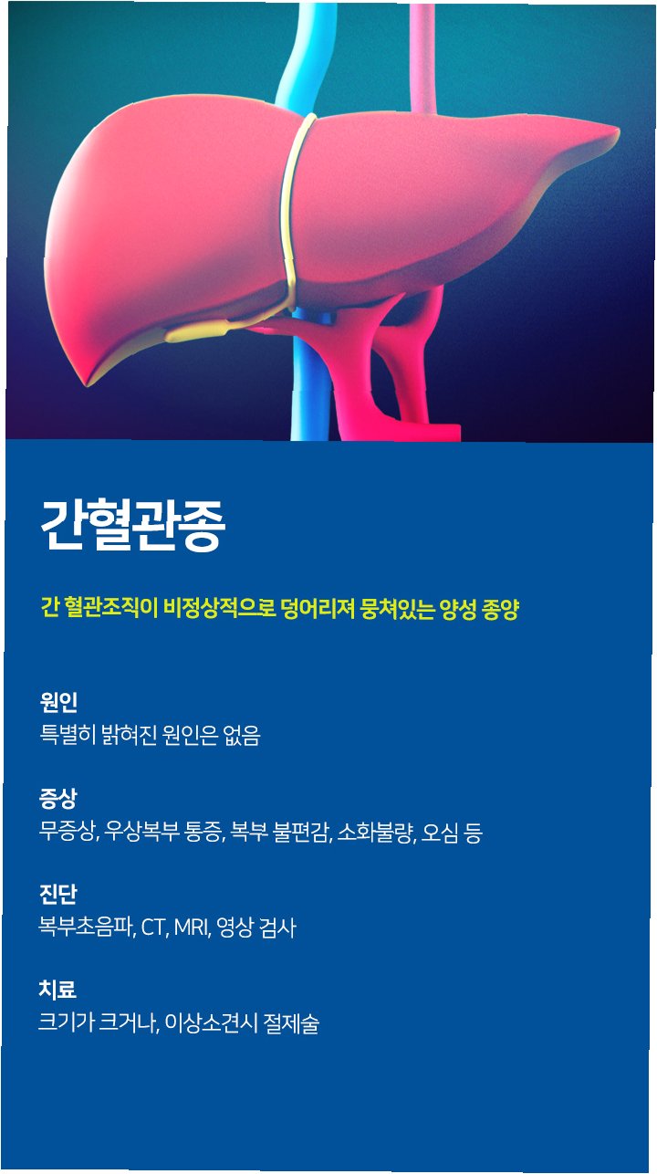 A.간혈관종은 간에 생기는 양성 종양으로, 대부분 증상이 없지만 크기가 커지면 복통, 소화불량 등을 유발할 수 있습니다.