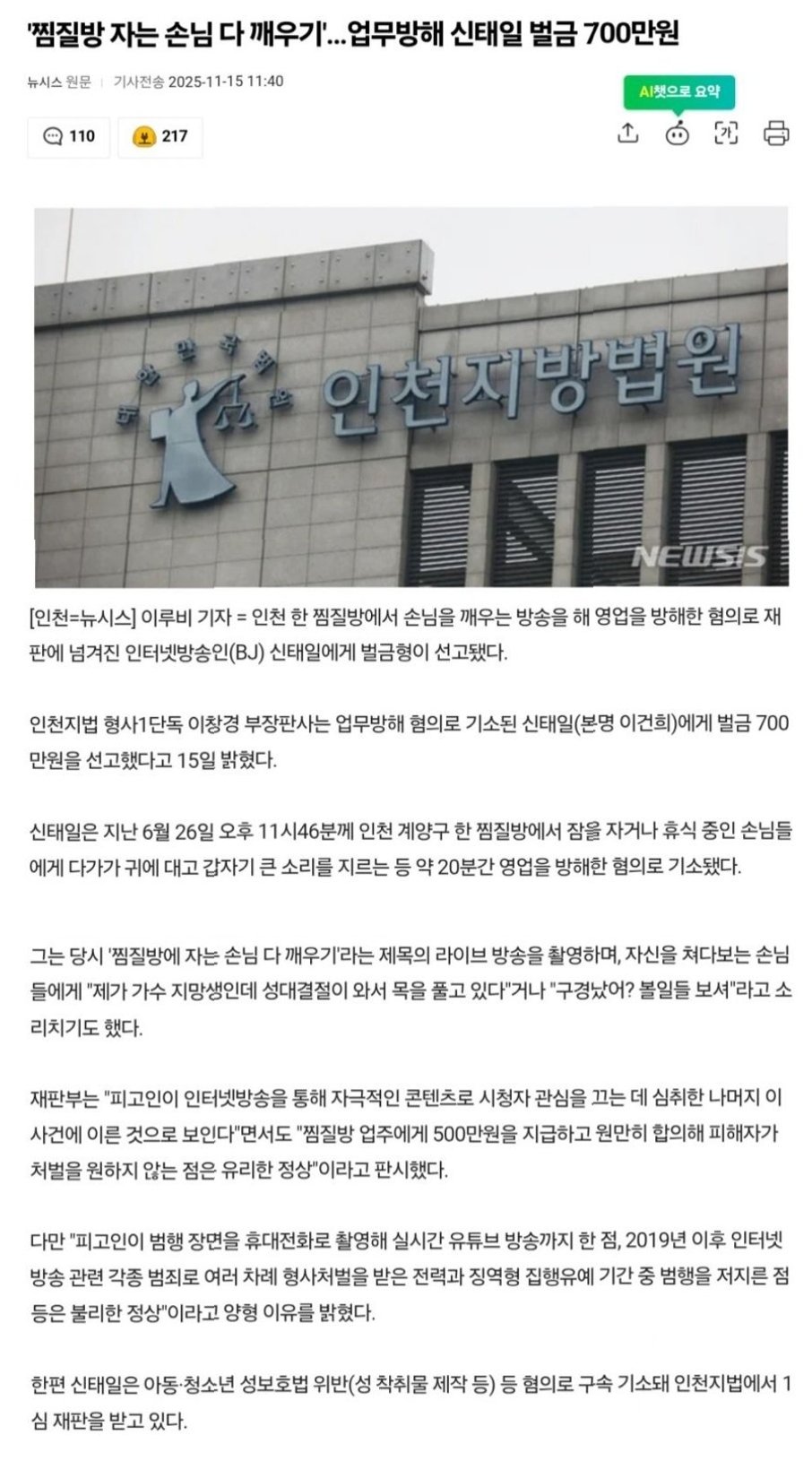 인터넷방송인(BJ) 신태일(본명 이건희)이 찜질방에서 잠든 손님들을 깨우는 방송을 해 영업을 방해한 혐의로 벌금형을 받았습니다. 15일 법조계에 따르면, 인천지법 형사1단독 이창경 부장판사는 업무방해 혐의로 기소된 신태일에게 벌금 700만원을 선고했습니다. 이는 찜질방에서 잠든 손님들에게 갑자기 큰 소리를 지르는 등 약 20분간 영업을 방해한 혐의에 대한 결과입니다.