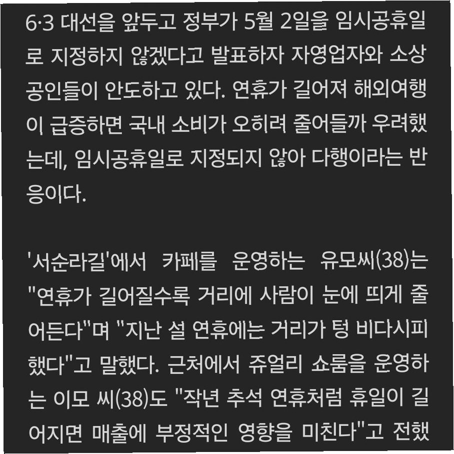 황금연휴, 해외여행객 증가와 임시공휴일 미지정으로 자영업자들의 시름이 깊어지고 있습니다. 하지만, 정부의 지원과 소비자들의 관심, 그리고 자영업자들의 노력이 함께한다면, 우리는 이 위기를 극복하고 자영업자들과 함께 웃을 수 있는 날을 만들 수 있을 것입니다. 국내 여행 활성화, 자영업자 지원 정책 마련 등, 다 함께 노력하여 따뜻한 경제 활력을 불어넣어야 합니다.