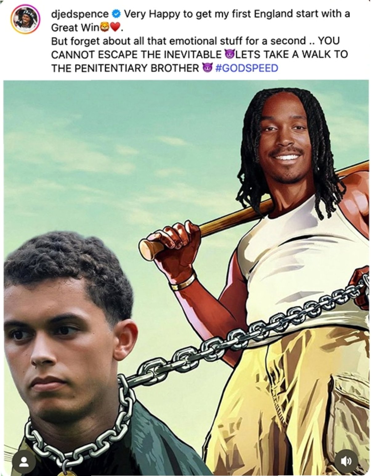 스펜스는 웨일스전 승리 후 자신의 SNS에 '그랜드 테프트 오토 V(GTA5)' 게임 표지를 패러디한 합성 사진을 게시했습니다. 사진 속에서 존슨은 강아지 얼굴로, 스펜스는 존슨의 목에 사슬을 채운 모습이었습니다. 이 사진은 팬들에게 큰 충격을 안겨주었습니다.