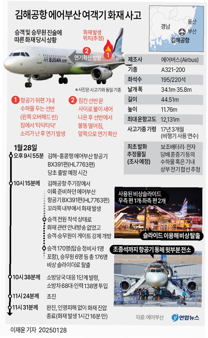 A.수하물 칸에 실린 여행객의 리튬 배터리 자연 발화로 추정됩니다.