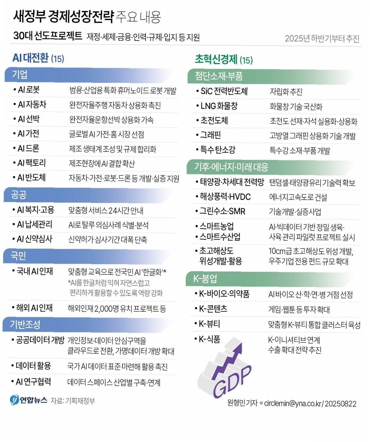 정부는 올해 1% 성장을 포기하는 대신, 미래 투자를 통해 잠재성장률을 끌어올리는 중장기 전략을 발표했습니다. 이는 인공지능(AI), 반도체, 로봇, 자동차 등 AI 대전환 프로젝트 15개와 바이오, 데이터, 우주 등 초혁신경제 과제 15개를 선정하여 재정, 세제, 금융, 규제, 입지 패키지를 총동원하는 방식으로 진행됩니다. 이러한 혁신 과제를 뒷받침하기 위해 100조 원 이상의 국민펀드도 조성할 계획입니다.