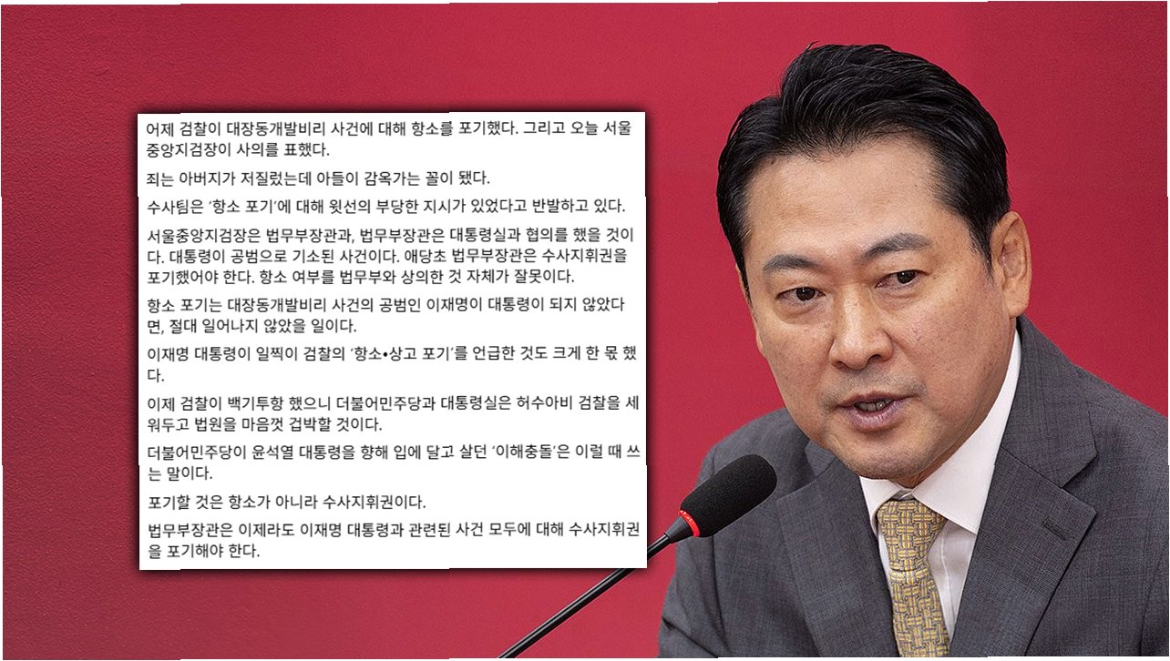 장동혁 대표는 검찰의 항소 포기에 이재명 정부가 개입했을 것이라는 의혹을 제기하며, 이를 '단군 이래 최악의 수사 외압이자 재판 외압'으로 규정했습니다. 그는 대통령이 지난 7월 국무회의에서 검찰의 항소를 강하게 비판한 것을 언급하며, 항소 포기가 사전에 지시된 것이라는 주장을 펼쳤습니다. 이는 사건의 진실을 은폐하려는 시도가 최고 권력층에서 시작되었음을 시사하며, 정치적 파장을 예고합니다.